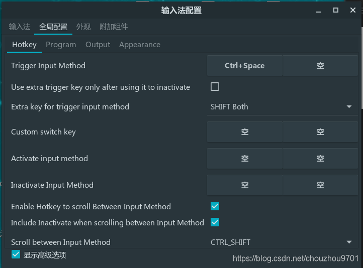 点击全局配置里面高级选项,然后找到ctrl+shift+b这个快捷键,点击后,按esc就可以将快捷键设置为空,不过需要重启电脑才能重启输入法,修改后不会立即生效