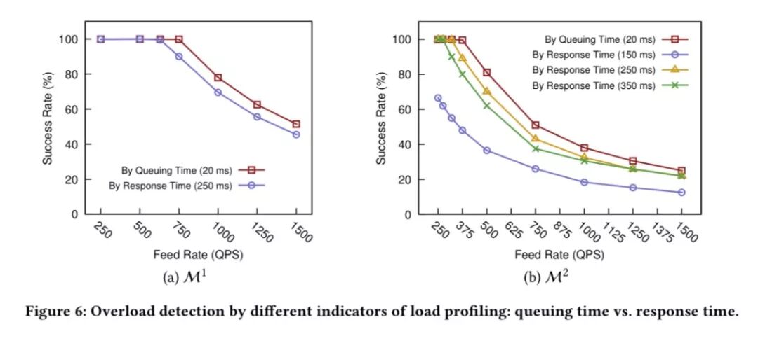 针对过载检测,鉴于微信中每个服务任务的默认超时为500ms,表明服务器过载的平均请求队列时间的阈值被设置为20ms。这种单凭经验的配置已经在微信业务系统中用了五年多,微信业务活动方面的系统稳健性已证实了其有效性。