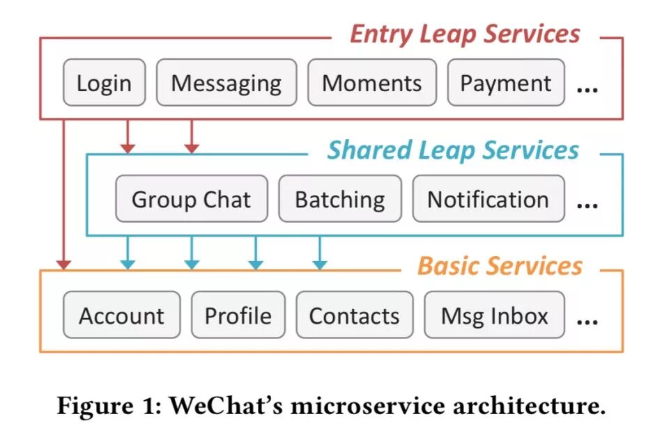 微信将其微服务分成这几大类:“Entry leap”服务(接收外部请求的前端服务)、“Shared leap”服务(中间层编排服务)和“基本服务”(不向任何其他服务敞开的服务,因而充当请求的接收器)。