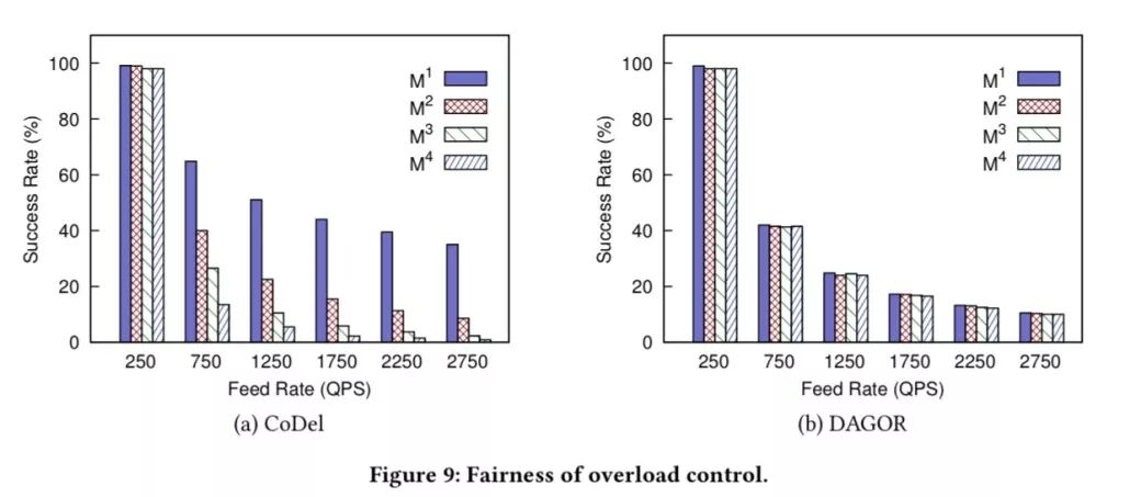 最后在公平性方面,可以认为CoDel在负载很大时优先处理向过载服务敞开较小的服务,而DAGOR面对各种请求时表现出了大致相同的成功率。