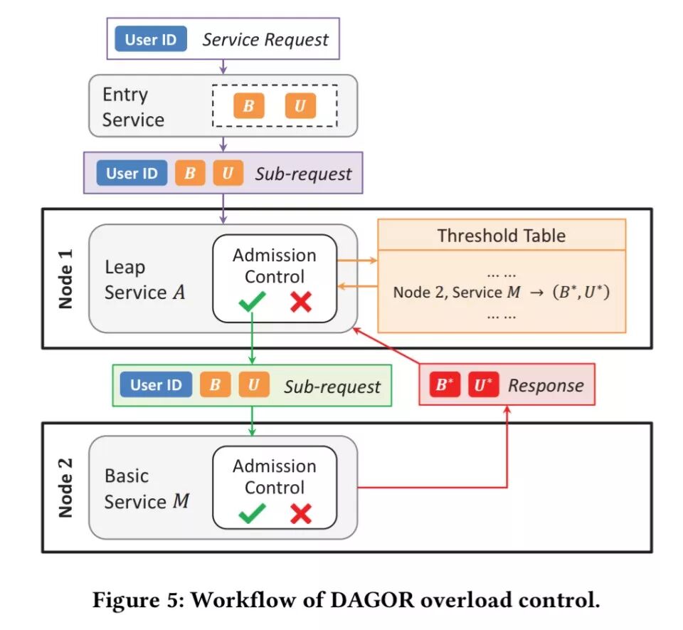 微信的过载控制系统名为DAGOR,它旨在为所有服务提供过载控制,因而旨在与服务无关。由于集中式全局协调的成本过于高昂,过载控制在单台机器的细粒度层面来运行。然而,它确实包含一种轻量级协作式机器间协议,处理后续过载情况需要该协议。最后,因过载而导致减载不可避免时,DAGOR会维持服务的尽力(best-effort)成功率。应尽量减少耗费在失败的服务任务上的计算资源(比如CPU和I/O)。