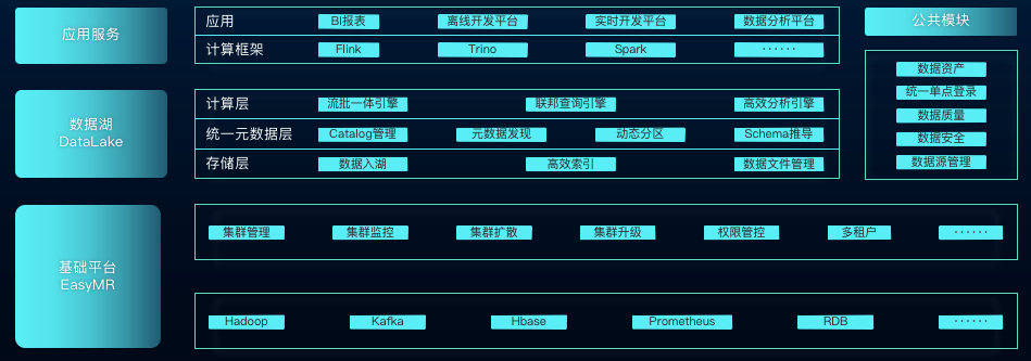 数驹主要包括两个平台产品:一是大数据基础平台——EasyMR,负责Hadoop、Hive、Spark、Flink、Kafka、Hbase等大数据组件的自动化集群部署、监控、迁移、升级等功能。