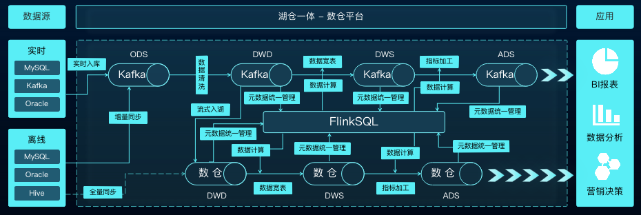 基于数驹平台的数据存储管理能力,可以同时支持上层计算引擎批和流的计算能力,帮助企业构建流批一体的数仓平台,实现一套架构同时满足流批业务操作,降低学习、使用、维护成本,提高开发效率。