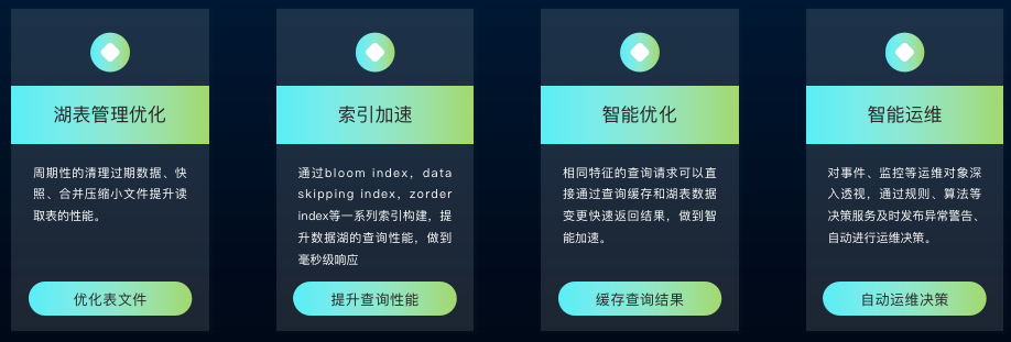 · 智能优化:相同特征的查询请求可以直接通过查询缓存和湖表数据变更快速返回结果,做到智能加速