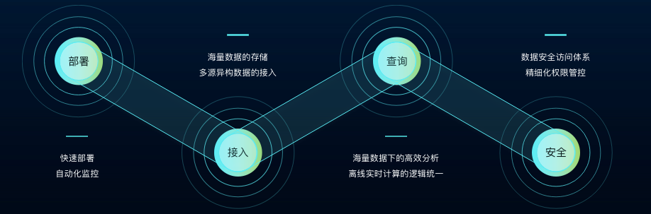在这个过程中会面临4个问题:一是部署问题,如何简单快速部署一套大数据组件;二是数据源接入问题,如何对接多源多种异构的数据源,这些海量的结构化,半结构化和非结构化数据如何存储;三是数据处理效率问题,在面对这些海量的数据时,如何降低数据开发处理的门槛,并提高数据分析的效率;四是数据安全问题,数据透出的时候如何做到精细化权限管控。