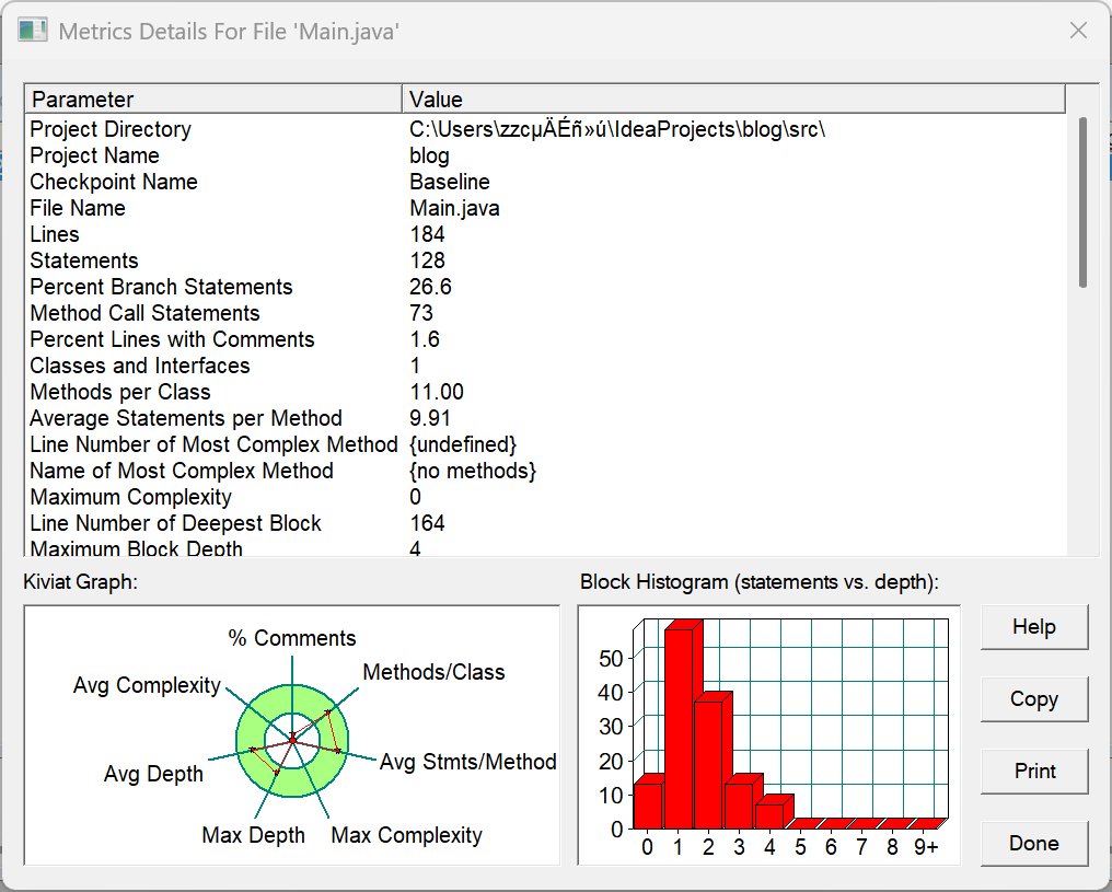 代码行数是 184 行,包含了 128 条语句和 73 次方法调用,分支语句占了 26.6%,平均每方法语句数大约是 9.91 条,这让我意识到代码有一定的复杂度,但整体还算可管理。不过,注释行占比只有 1.6%,这明显是不够的,我应该在代码中添加更多注释,以便日后维护和他人阅读。代码中定义了一个类,包含 11 个方法,最深嵌套块深度是 4,出现在第 164 行,这提示我在某些地方可能写了一些比较深的嵌套逻辑,未来可能需要重构以降低复杂度。