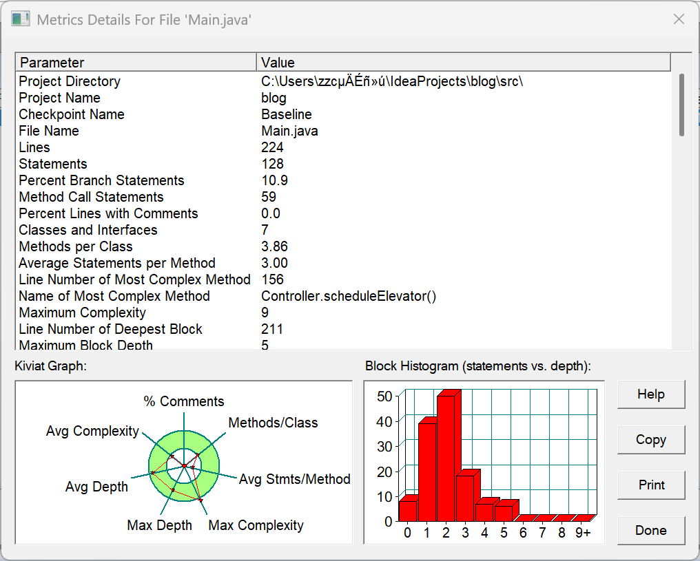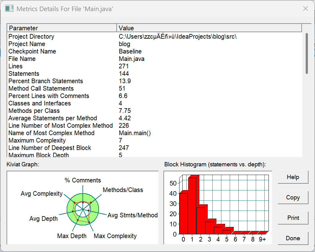 在对 Main.java 文件进行代码度量分析时,我发现这份报告揭示了代码的一些关键特性。代码行数达到了 271 行,其中包含 144 条语句和 51 次方法调用,这表明代码具有一定的复杂度。分支语句占比 13.9%,显示代码中存在条件逻辑,而平均每方法语句数为 4.42 条,提示方法的复杂度相对较低。注释行占比 6.6%,虽然比理想情况稍低,但至少提供了一些基本的注释。代码定义了 4 个类或接口,每个类平均拥有 7.75 个方法。最复杂的函数是 Main.main(),其复杂度达到了 7,位于第 226 行。最深的嵌套块深度为 5,出现在第 247 行。