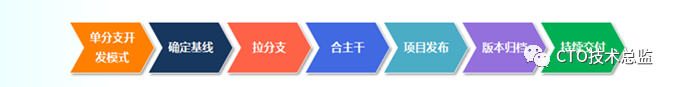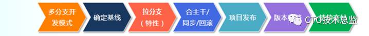 确定基线、拉(特性)分支、同步/回滚/合主干、项目发布、版本归档、持续交付
