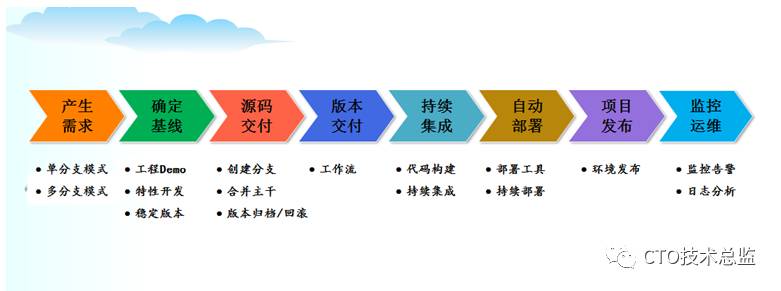 确定基线、拉分支、合主干、项目发布、版本归档、持续交付