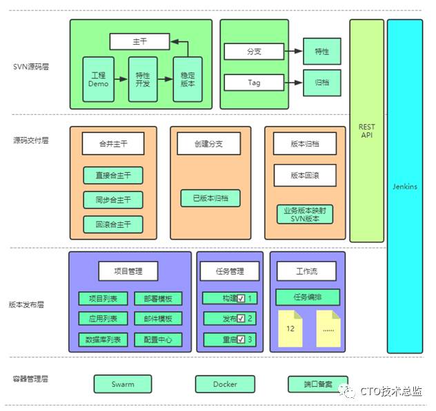 版本交付层通过项目管理、任务管理、工作流管理功能实现持续集成、自动部署、一键发布。