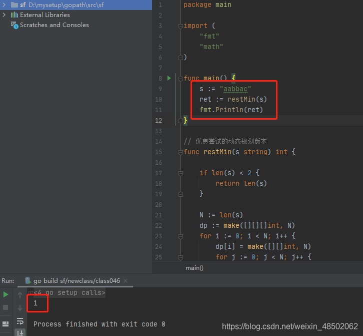 2021-04-27:如果一个字符相邻的位置没有相同字符,那么这个位置的字符出现不能被消掉。比如:“ab”,其中a和b都不能被消掉 。如果一个字符相邻的位置有相同字符,就可以一起消掉。比如:“abbbc”,中间一串的b是可以被消掉的, 消除之后剩下“ac”。某些字符如果消掉了,剩下的字符认为重新靠在一起。给定一个字符串,你可以决定每一步消除的顺序,目标是请尽可能多的消掉字符,返回最少的剩余字符数量。比如:“aacca”, 如果先消掉最左侧的"aa",那么将剩下"cca",然后把"cc"消掉,剩下的"a"将无法再消除,返回1。但是如果先消掉中间的"cc",那么将剩下"aaa",最后都消掉就一个字符也不剩了,返回0,这才是最优解。 再比如:“baaccabb”,如果先消除最左侧的两个a,剩下"bccabb",如果再消除最左侧的两个c,剩下"babb", 最后消除最右侧的两个b,剩下"ba"无法再消除,返回2。而最优策略是:先消除中间的两个c,剩下"baaabb",再消除中间的三个a,剩下"bbb",最后消除三个b, 不留下任何字符,返回0,这才是最优解。