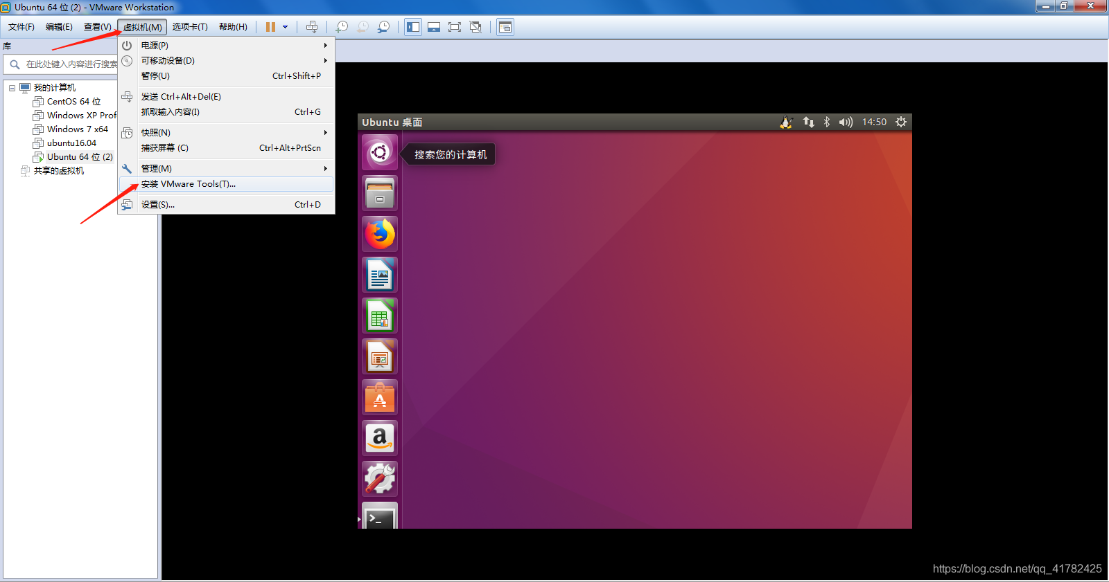1.点击VMware 窗口上方的虚拟机---安装VMware Tools,如下图所示