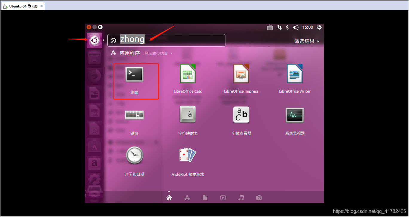 3.点击Ubuntu桌面左侧栏上方的搜索按钮,输入终端,打开终端命令窗口(快捷键:Ctrl+Alt+T)