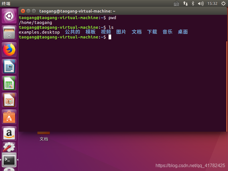 4.在命令终端输入pwd:查看当前路径,ls 查看当前路径下的文件,因为我们当初安装时选择中文简体以及汉语,所以导致文件名为中文,cd 进入目录无法输入桌面两个汉字,只有复制桌面两个字再粘贴到命令行,这样太不方便了,所以建议安装时选择英文,如果想将中文目录名转成英文的,依次输入以下三行命令:(每执行一条命令,记得敲回车)