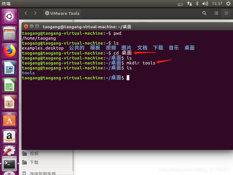 5.在终端输入 cd 桌面,进入桌面 再输入mkdir tools 创建tools文件夹(用来存放VMware Tools的解压后的文件)