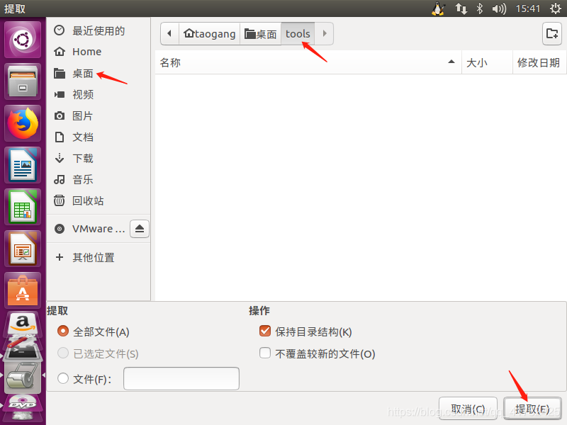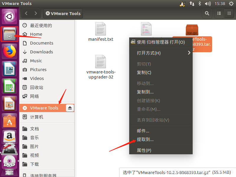 6.点击窗口栏左侧第二个文件夹图标,选择VMware Tools,右击tar.gz格式文件,点击提取到