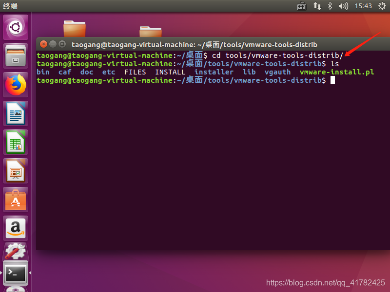 8.点击左侧栏的终端,执行cd tools/vmware-tools-distrib/ 进入解压后的文件路径,执行ls 查看当前路径下的文件