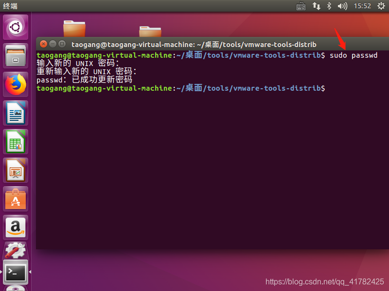 9.因为是刚安装的Ubuntu 所以需设置超级管理员密码,在终端输入sudo passwd 设置超级权限密码即可