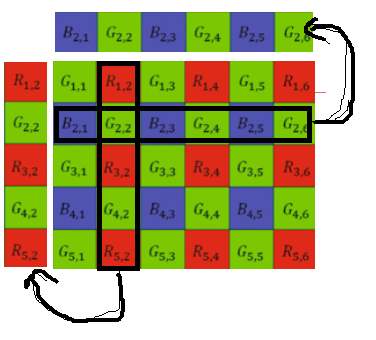 这样每个pixel可以插值两个pixel组成RGB三通道。