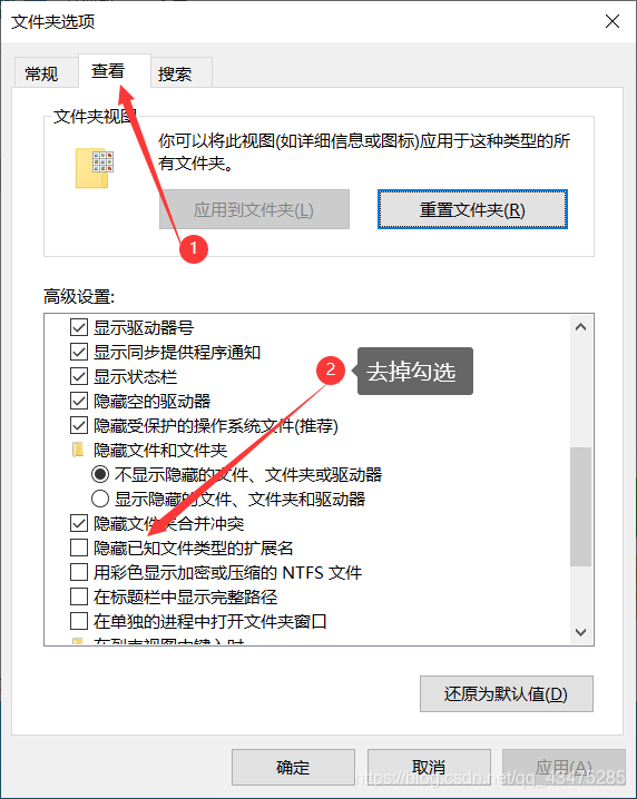 找到“隐藏已知文件类型的扩展”的设置方法如下: