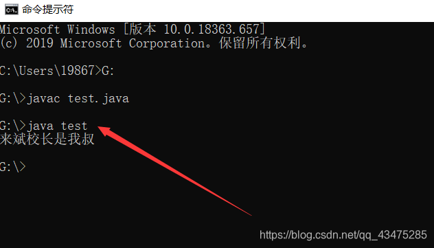 下面运行程序,输入:java test (这一次没有.java后缀)运行成功