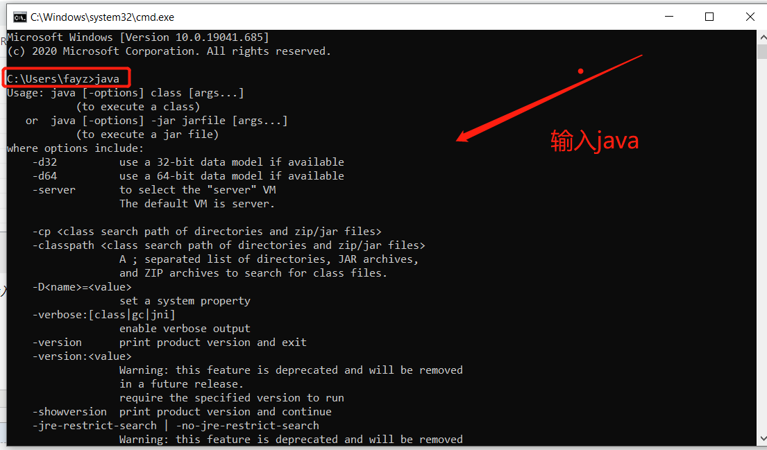 (4)WIN+R键打开运行输入cmd回车来打开命令行,分别输入Java回车,Javac回车,Java -version回车来验证,