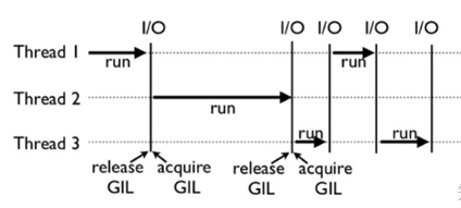每个线程使用前都会去获取GIL权限,使用完释放GIL权限。释放线程的时机由python的另一个机制check_interval来决定。