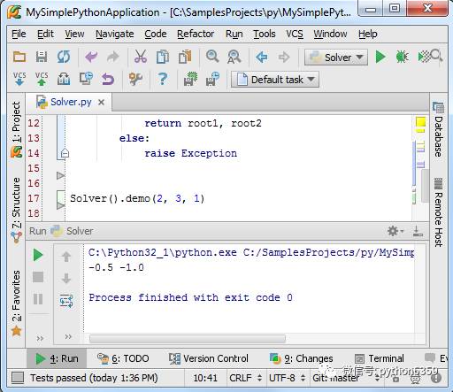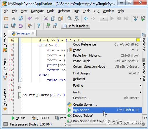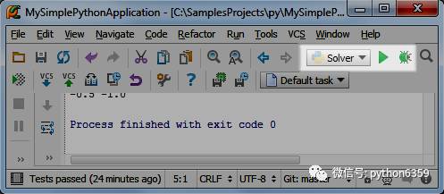 打开之前编写的Solver.py文件,在编辑框中右键,选择快捷菜单中的“Run 'Solver'”选项。此时脚本文件正常运行并在调试工具窗口中显示程序的输出值: