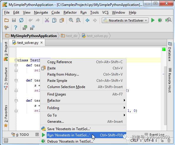 一切就绪后,右击测试类名,在弹出的快捷菜单中选择运行命令: