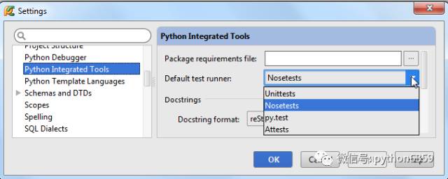 首先,需要指定一个测试器。单击工具栏的设置按钮,打开Settings/Preferences对话框,然后单击进入Python Intergated Tools页面(可以通过搜索功能找到),默认选择如下:
