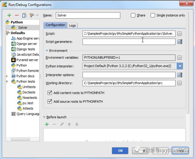 在左侧目录中将会出现两个节点:Python和Default。在第一个节点目录下有一个单一的配置选项'Solver',在第二个选项下则有很多配置信息。