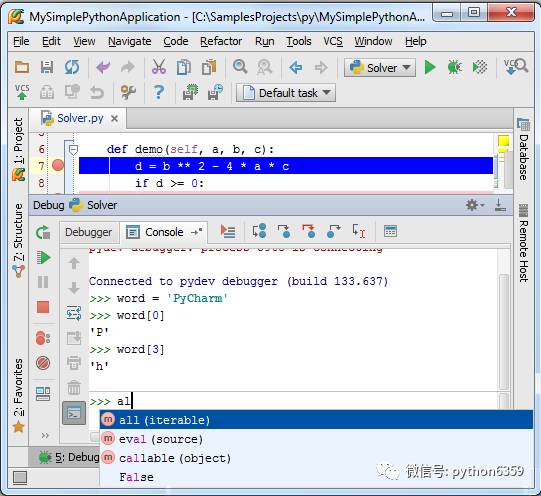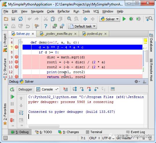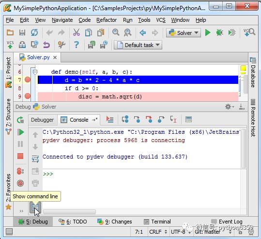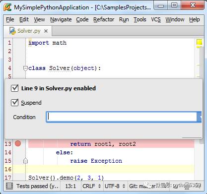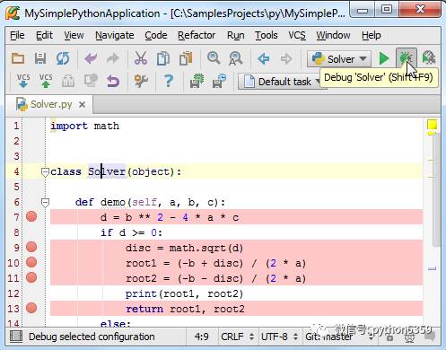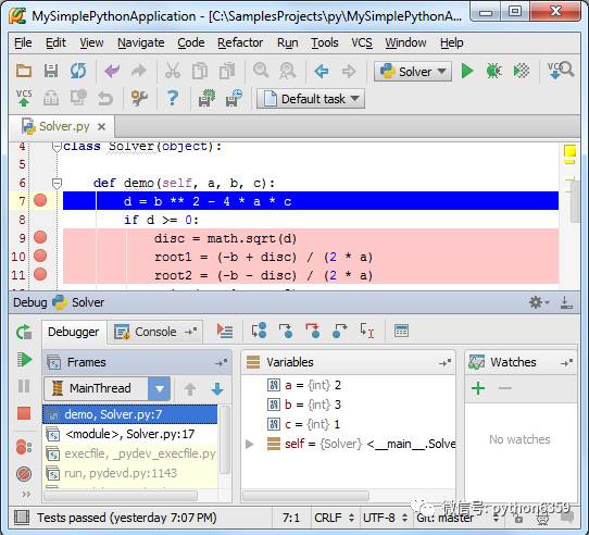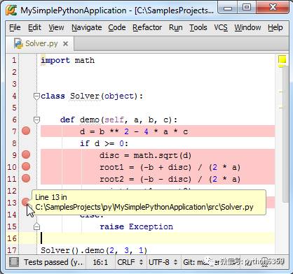 在Pycharm中我们可以在其中直接对程序进行调试,唯一需要做的准备工作就是在程序必要的地方加设断点,接下来我们进行详细的介绍:
