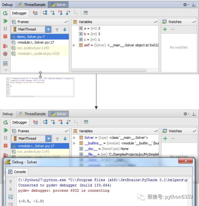 OK,现在程序暂停在了第一断点处,Frames窗口显示的是Solver脚本的第7行代码所对应的进程demo,相关变量a、b、c已经定义,但变量d尚未进行定义。接下来?