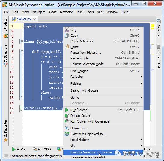打开Solver.py文件(打开的方法多种多样,例如Ctrl+E - View → Recent Files),全选文件中的代码内容(Ctrl+A, or Edit → Select All),然后按下Alt+Shift+E(或者右击在弹出的快捷菜单中选择Execute Selection in Console):此时,Pycharm就会自动将选中的代码导入到控制台界面,方便我们对其进行编辑: