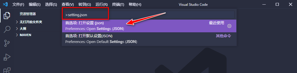 进入vscode,按 Ctrl+shift+p 快捷键打开全局搜索输入 setting.json 打开配置文件