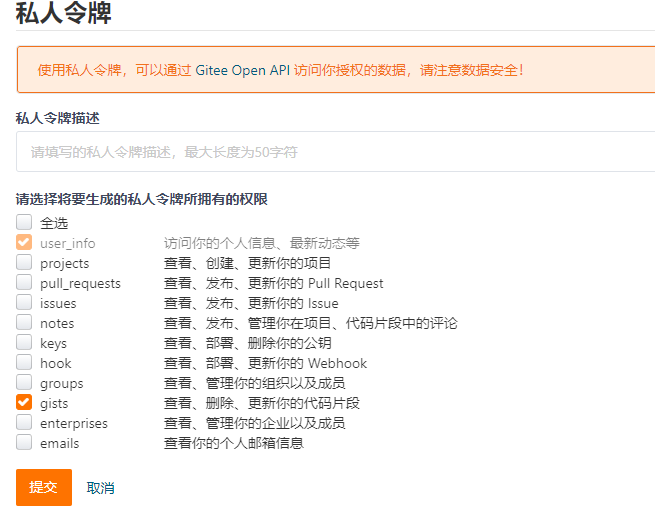 这里不需要勾选太多,除了默认的,就勾选一个gists就可以了: