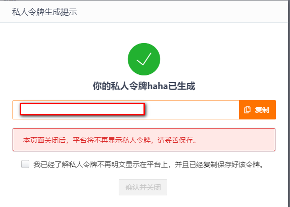注意:提交后不要急着退出页面,一定要保存好这个令牌,因为就会生成一次,退出此页面就不会再显示了,当然我们如果真的忘记了也可以创建新的: