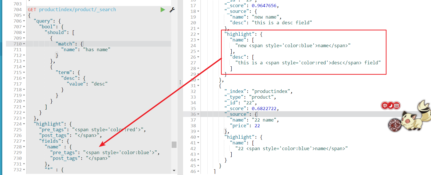 2、匹配name字段中有has name的值或desc字段中有desc的值,并对匹配到的值进行高亮