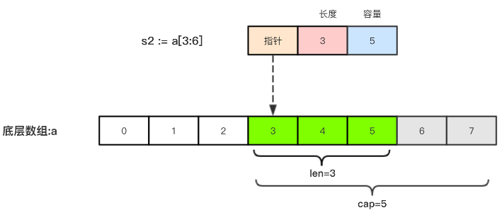 举个例子,现在有一个数组a := [8]int{0, 1, 2, 3, 4, 5, 6, 7},切片s1 := a[:5],相应示意图如下。