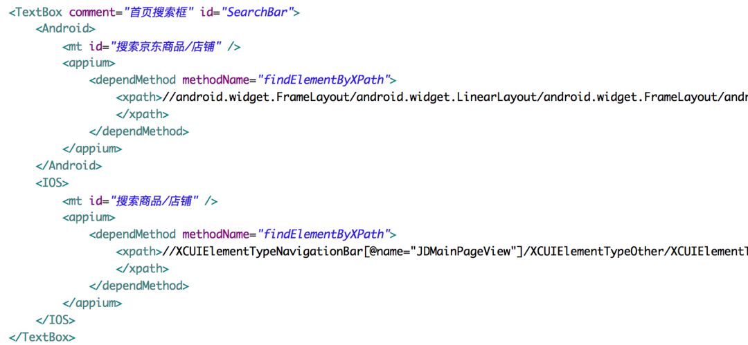 其中dependMethod为控件查找方式,内嵌元素为查找的值。由于在编写操作方法时引用的是自定义ID,且ID不会改变。所以在Operation层封装的所有操作是不会因为控件改变而修改代码的。一对一的关系即:控件修改 —> xml配置修改。
