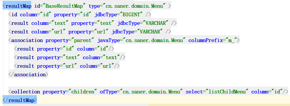 javaType和ofType都是用来指定对象类型,保证了类型安全。反向用select是必须要用ofType。javaType是指POJO类中的属性类型,比如下面的id,text,url,parent