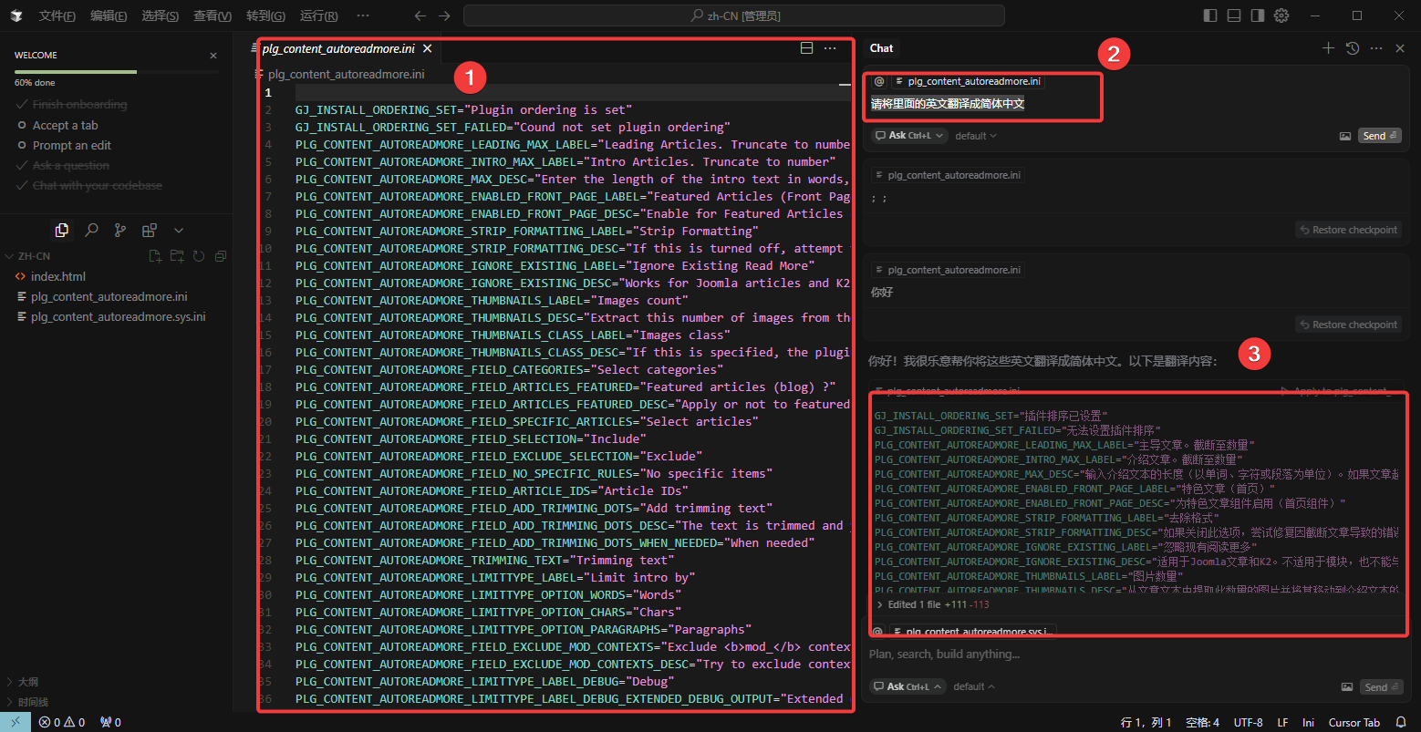 原本我以为还需要做一些预处理,但实际操作却非常的简单。只需要将文件在编辑器中打开,然后在聊天窗口输入“请将里面的英文翻译成简体中文”,等待片刻,就得到了结果。而且效果还不错。