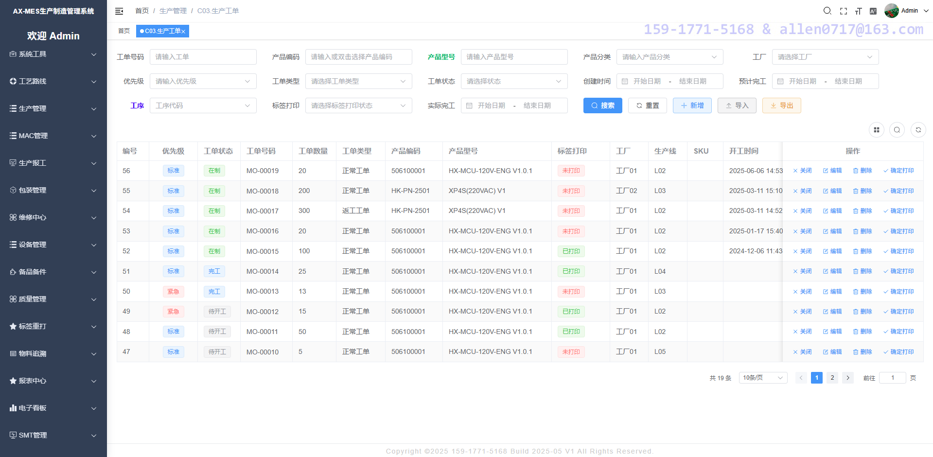 PMC根据生产计划在系统中创建工单,包括所属客户、所属产品编码、工单数量、SKU、预计交货日期等信息,发布工单之后系统自动根据工单数量产生唯一的序列号,这些序列号将用在每一个产品上面,整个生产过程中都以这个唯一的产品 SN 进行追溯。