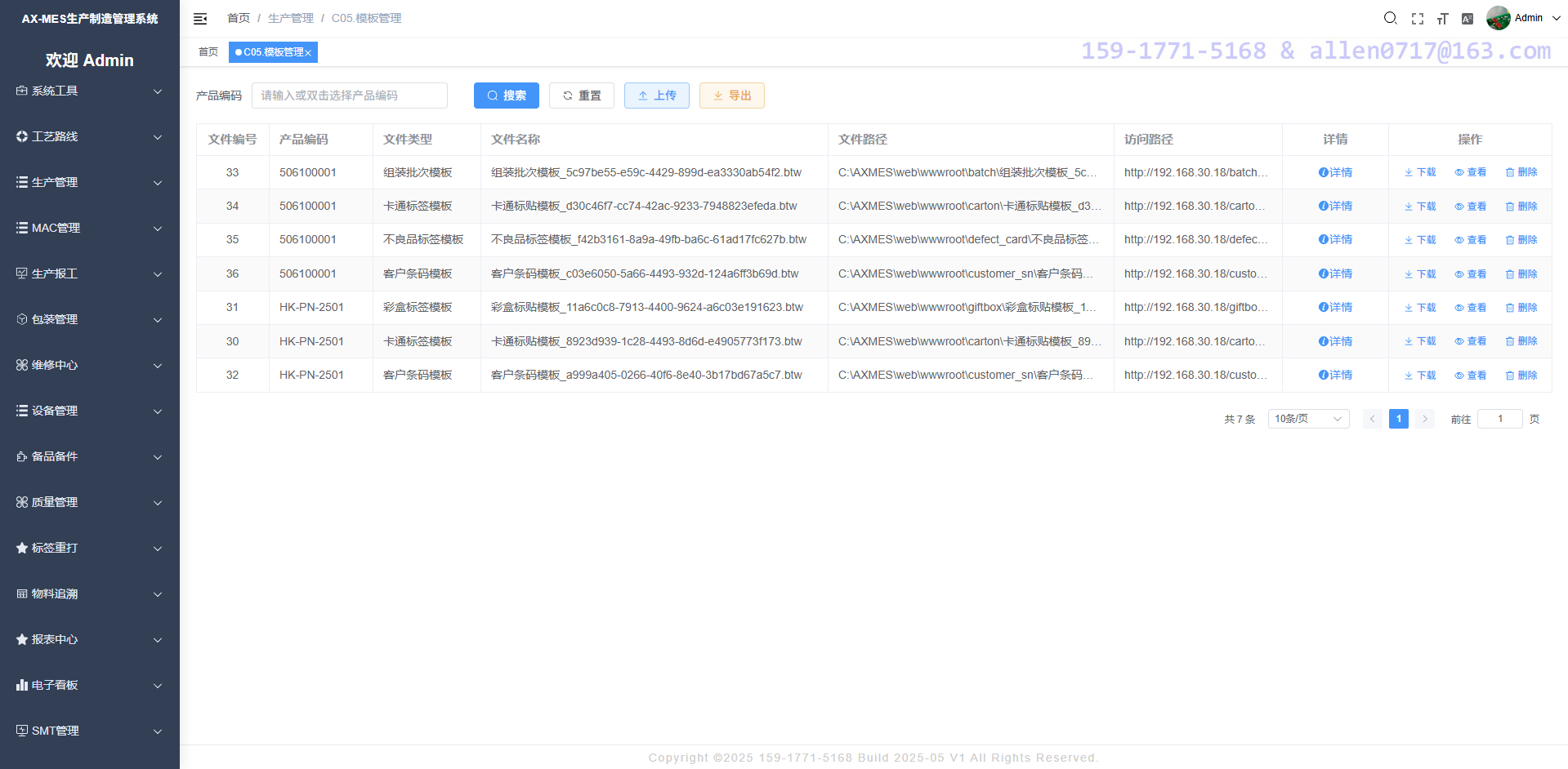 生产过程中包括彩盒条码打印、卡通标签打印等等、系统支持上传模板文件、系统每次从系统中下载模板进行打印。
