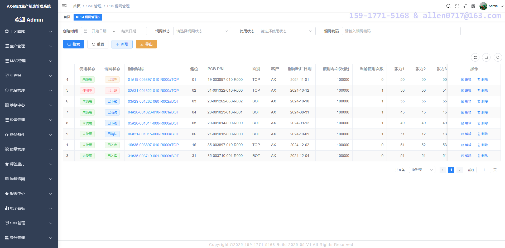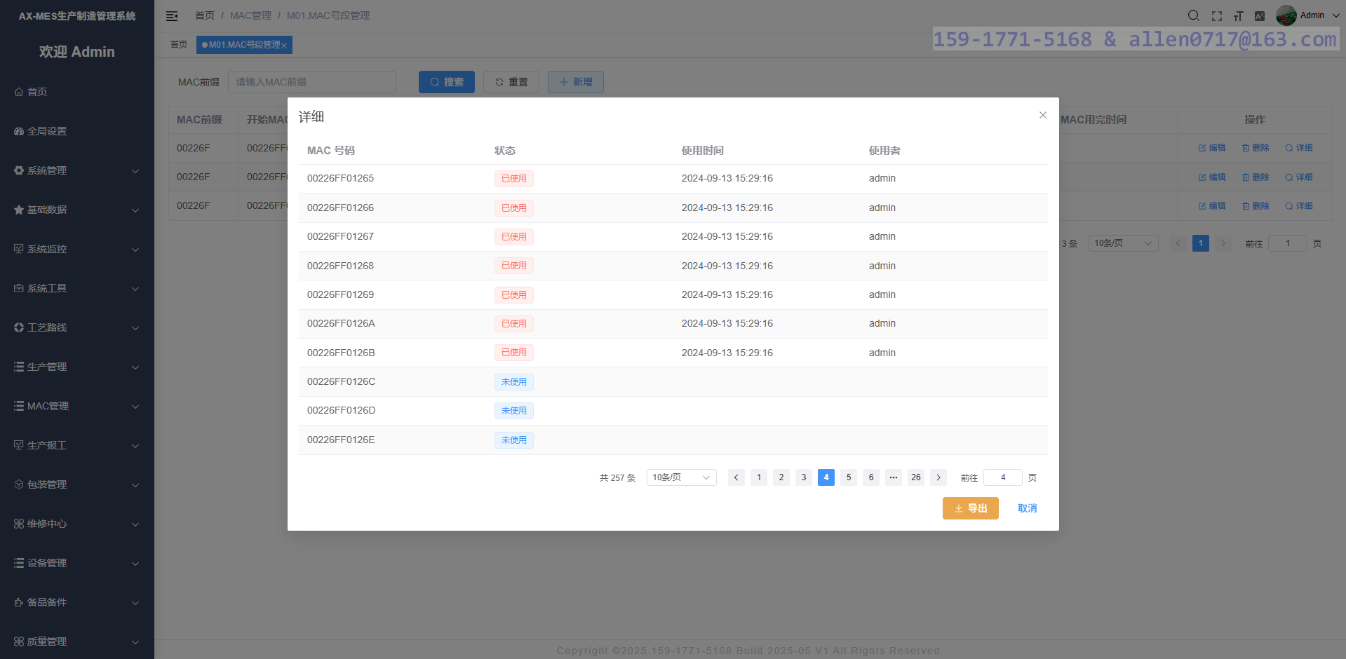 系统支持MAC或者其他类型的条码管理,MAC地址使用之后系统会标记为使用状态,防止生产线使用重复的 MAC 地址。