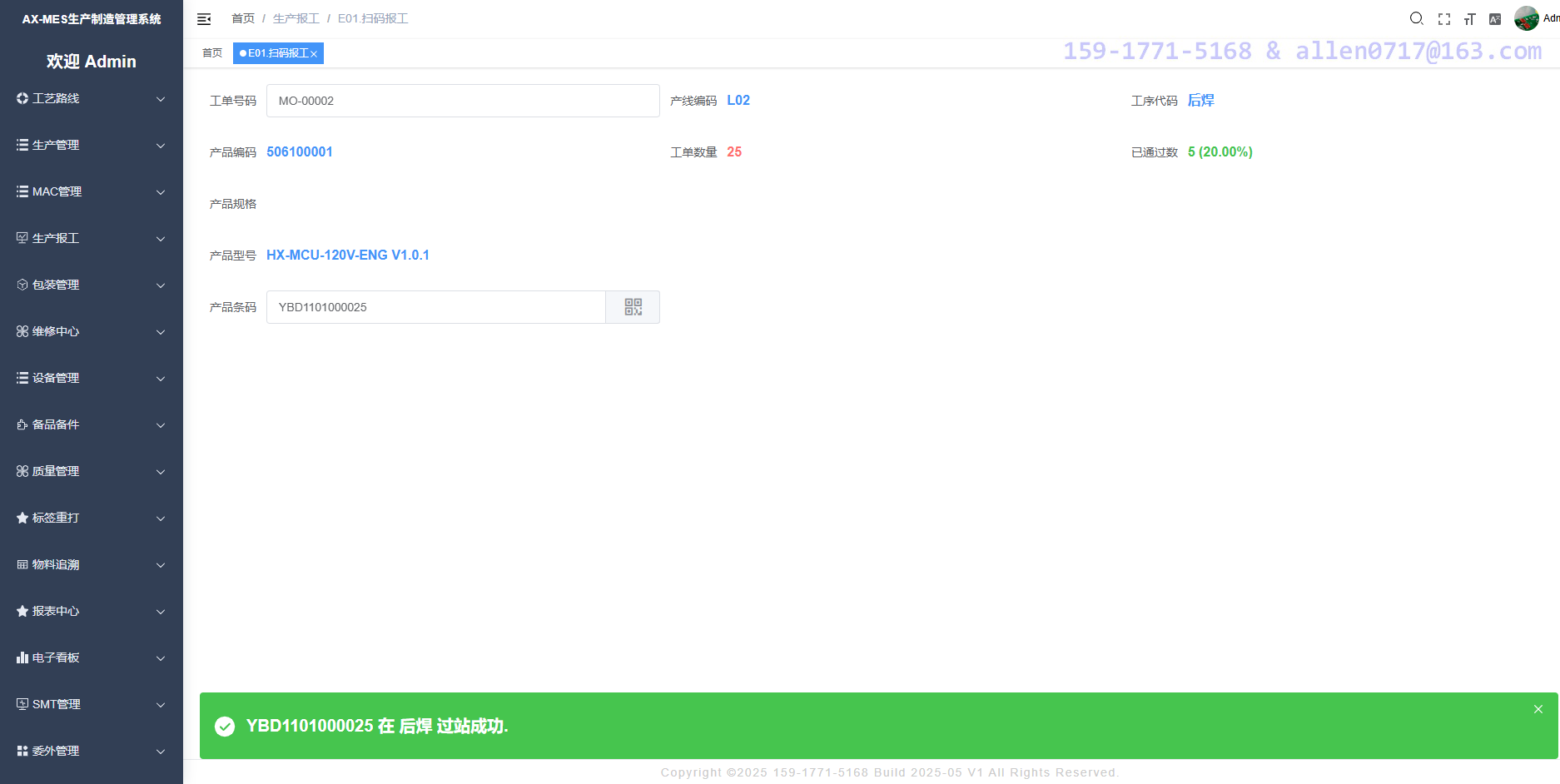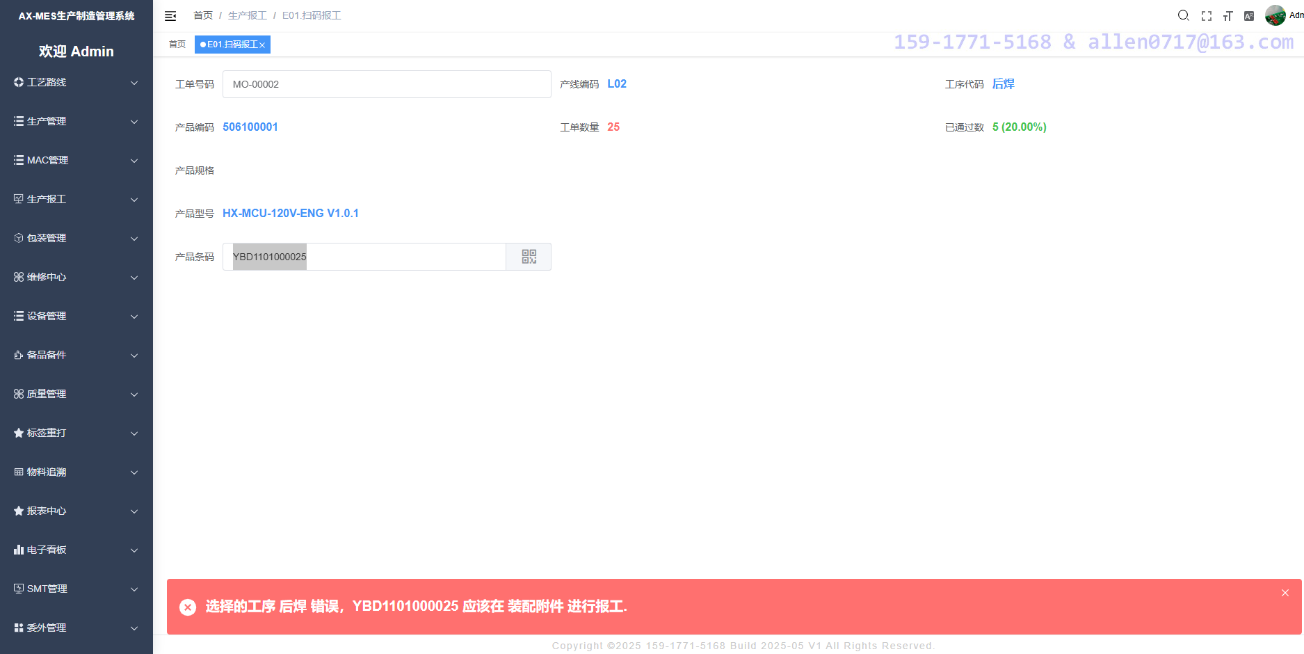 生产线扫描产品上面的镭射的二维码或者粘贴的纸质条形码,系统自动判定当前产品是否应该在当前工序报工,有效追溯每一个产品的详细生产记录。