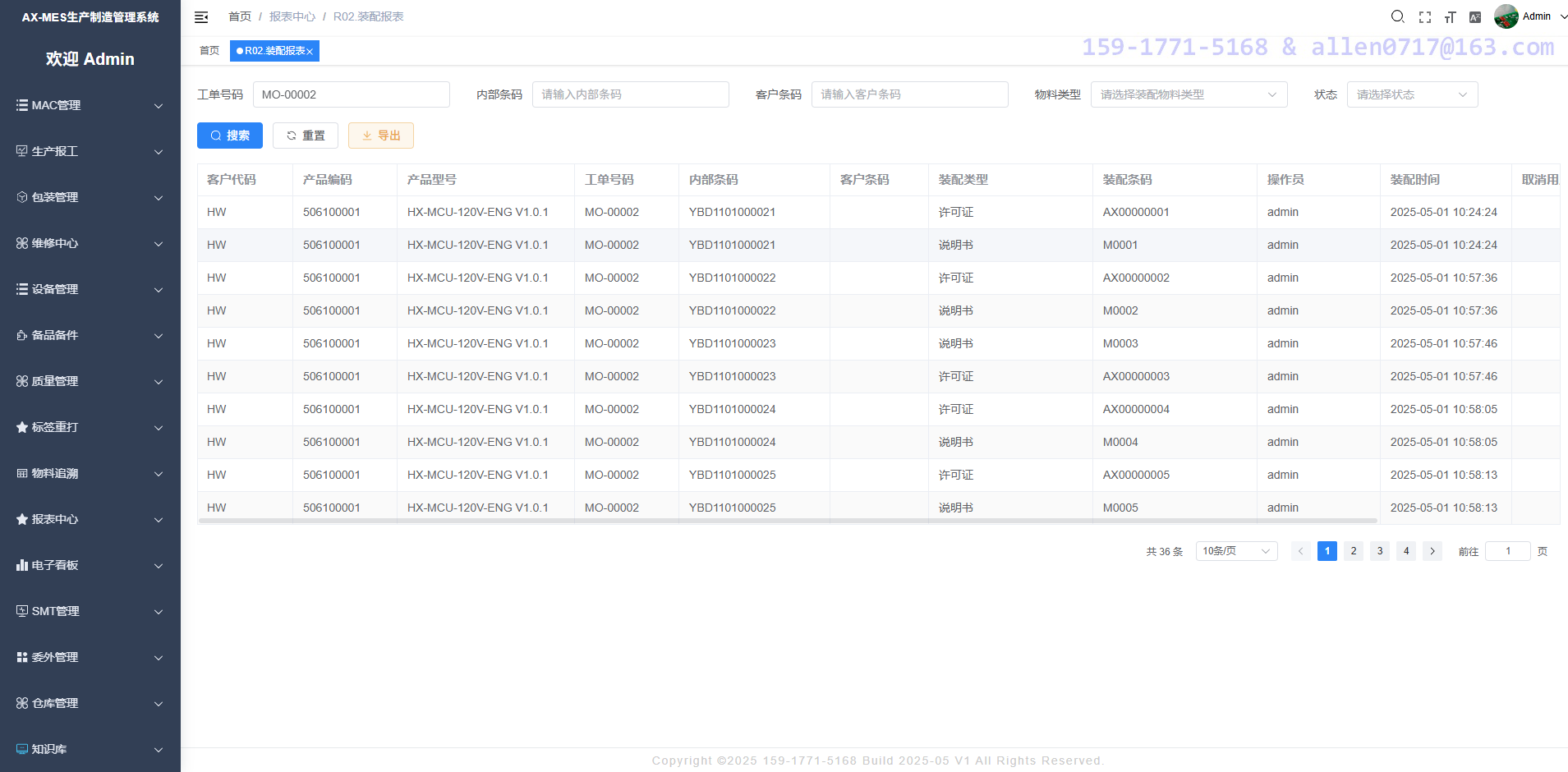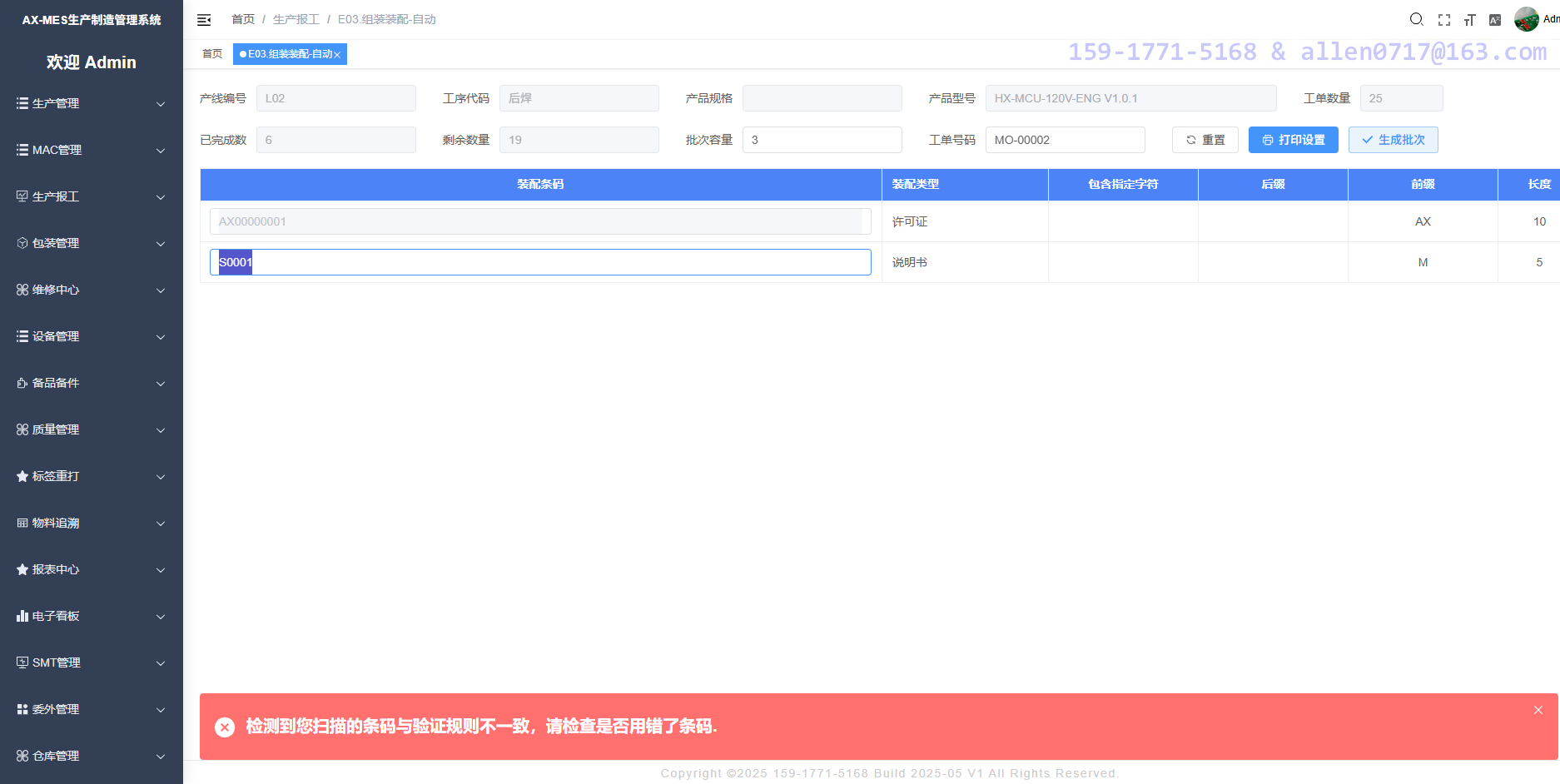 根据产品编码定义装配规则,可满足各种复杂的追溯需求,比如将 MAC 地址、许可证号码、说明书、火牛等装配件与产品 SN 进行一对多绑定,并支持正方向查询。