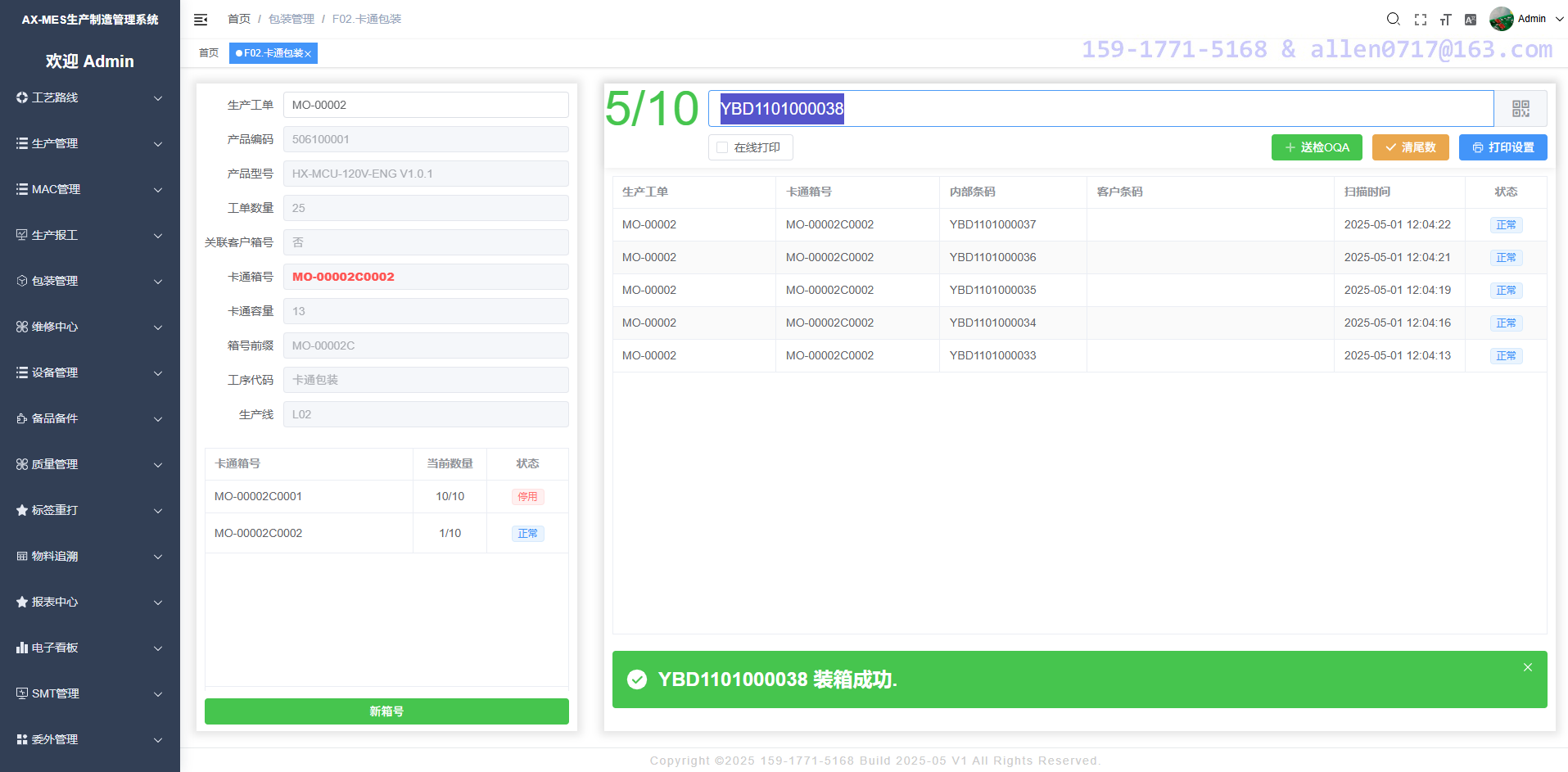根据产品编码定义包装规则,包括每一个卡通箱的包装容量,包装完成之后系统自动在线打印卡通标签。