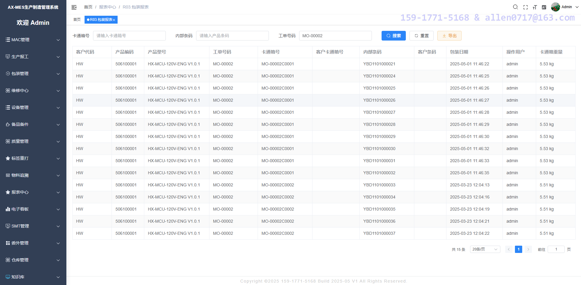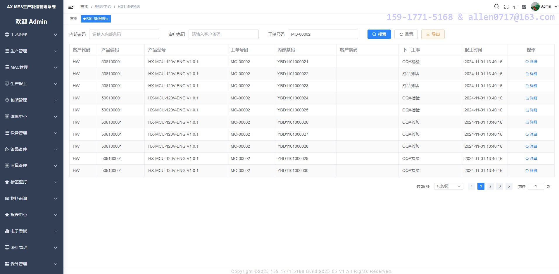 通过工单号码查询每一个产品 SN 所关联的装配件信息,可导出至 Excel。