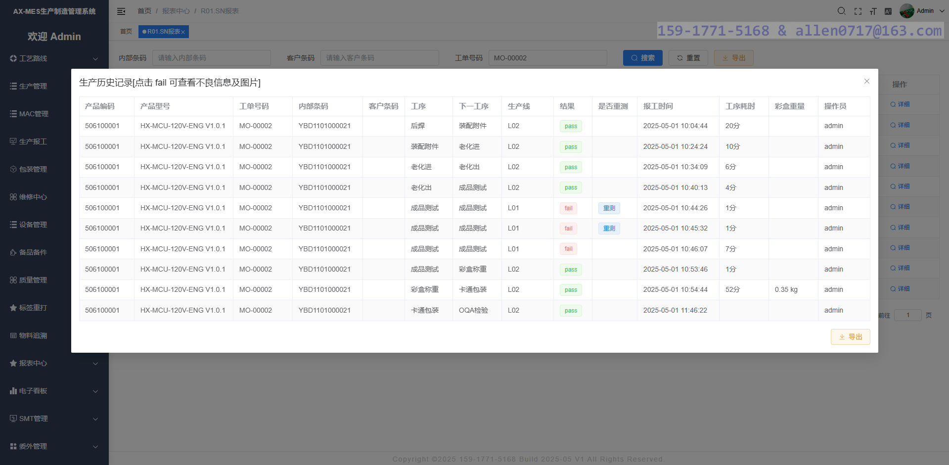 通过产品 SN 查询该产品的生产历史记录,包括每一个工序的生产时间、生产线、操作用户等详细信息。